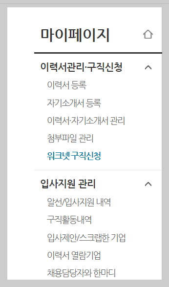 워크넷에 로그인 후 마이페이지에 이력서 관리, 구직 신청에서 워크넷 구직 신청에 들어갑니다.