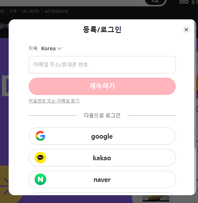 이메일 주소나 전화번호를 입력합니다. 아니면 아래에 구글, 카카오, 네이버 아이디로도 가입이 됩니다.
