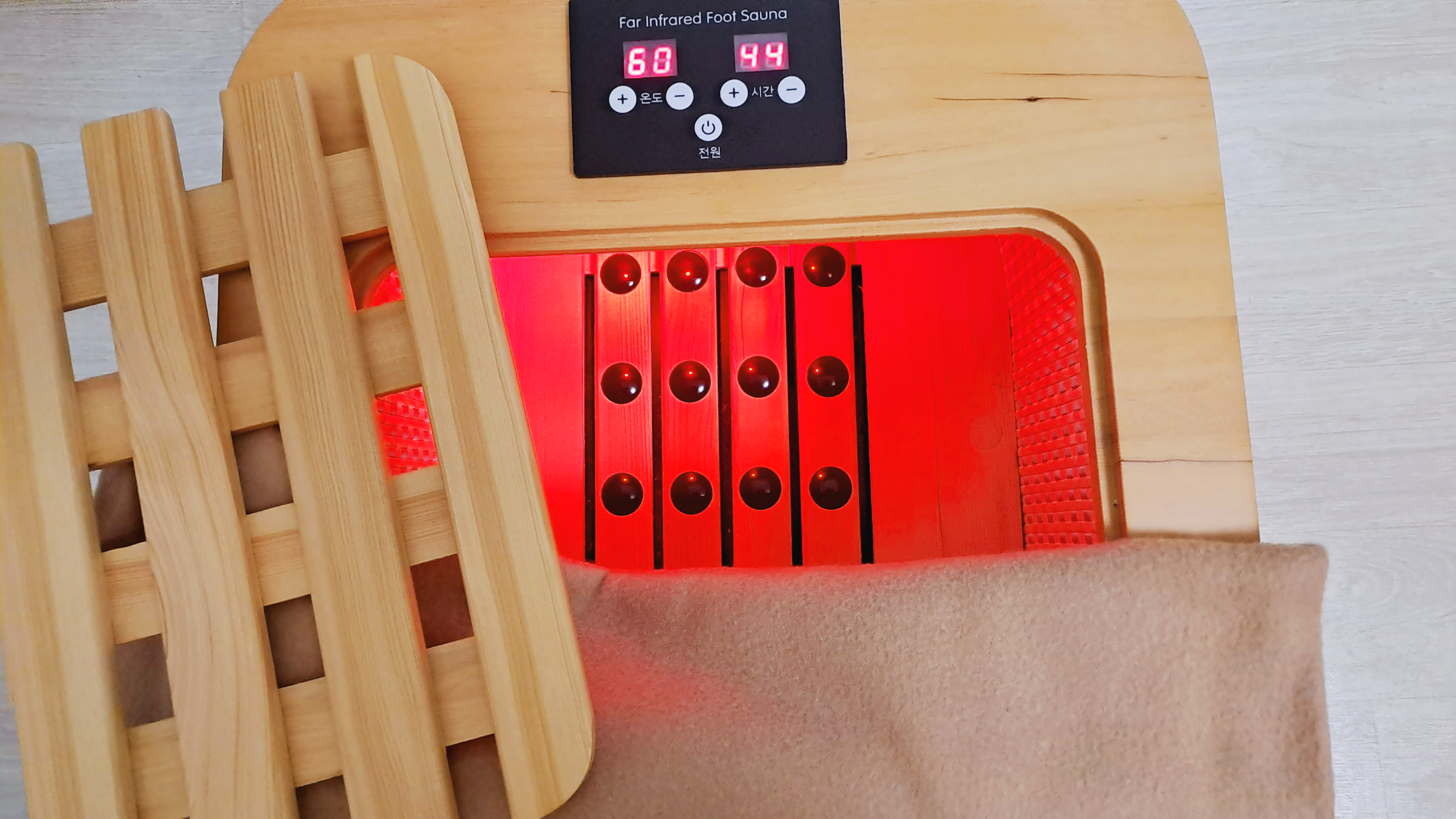 위 사진의 왼쪽 숫자는 온도, 오른쪽은 시간을 설정할 수 있습니다. +와 - 표시를 누르면 온도는 최대 65도 시간은 최대 99분까지 설정할 수 있습니다. 발을 넣고 무릎덮개로 다리를 감싸거나, 격자로 된 나무판을 얹고 앉아 좌욕을 할 수 있습니다. 전원버튼을 누르면 55도와 60분이 세팅되어 나타납니다. 저는 최대치인 65도와 99분에 맞추고 사용합니다.