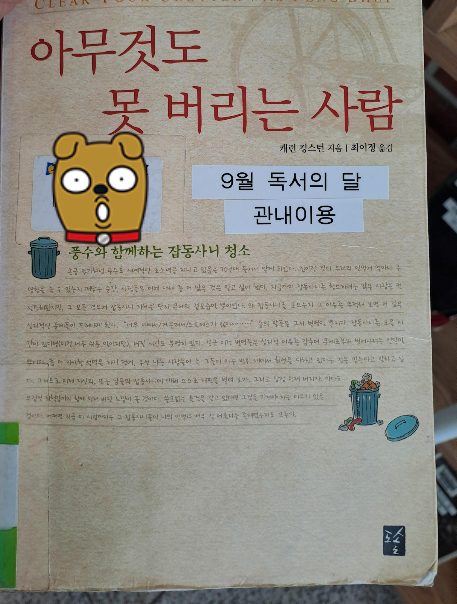도서관 로비에 관내 이용으로 책꽂이에 있는 책들을 보다 나의 고민과 맞닿은 책을 발견, 그 자리에서 펼쳐서 읽었습니다. <아무것도 못 버리는 사람>의 제목으로 이 책을 빌려서 읽은 후기가 메모되어 있기로 그분은 5톤 트럭인가 그렇게 많이 버렸다고 합니다.