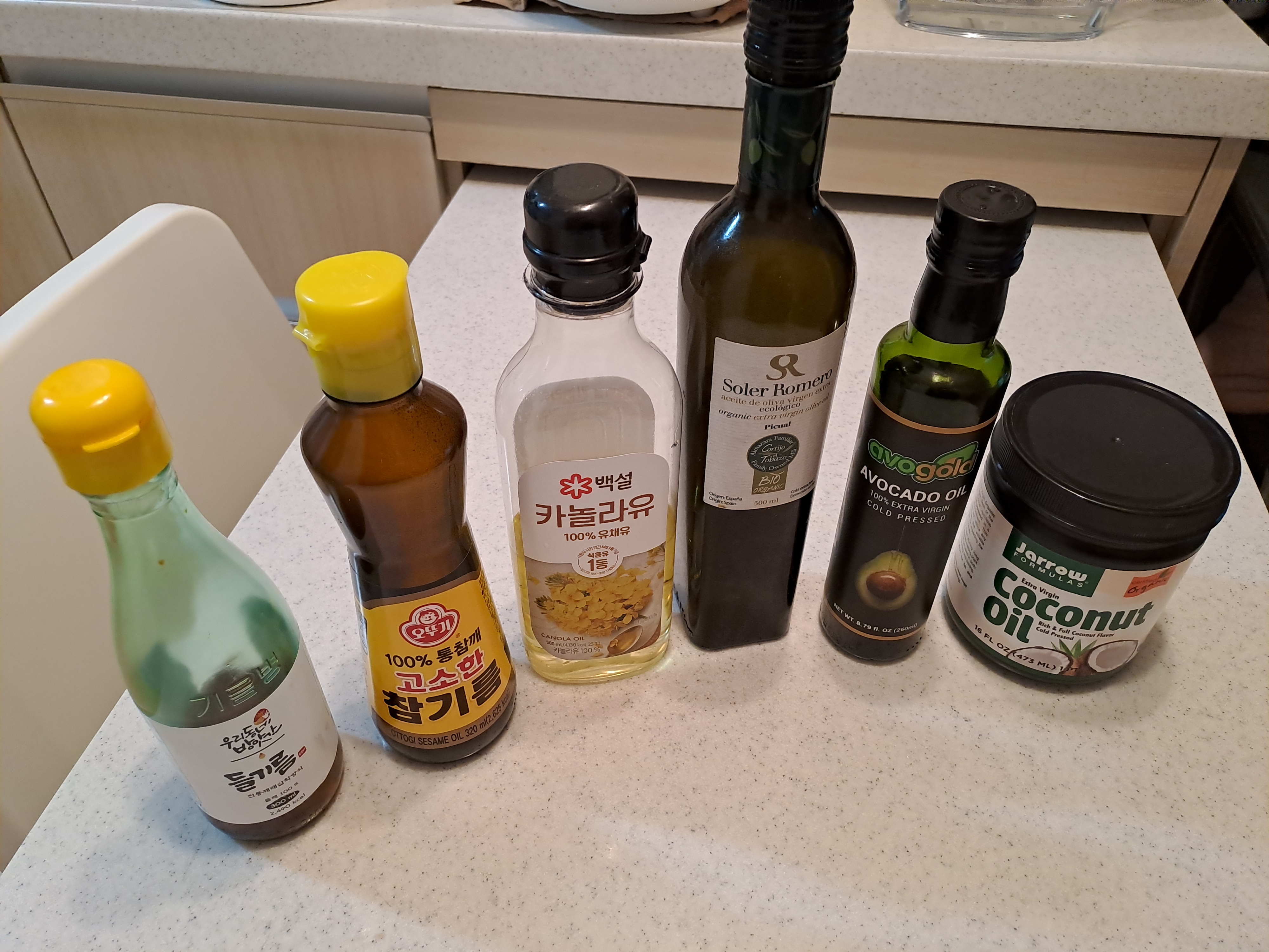 제가 어릴 때는 식용유라고 하나였던 걸로 기억나는 데, 요즘은 어찌나 종류가 많은지, 무엇을 사야 할지 선택하기가 어려울 때가 있습니다. 고온에서 쓰면 안 되는 오일이라 드레싱으로만 써야 하는 오일도 있고, 고온에 가능해서 달걀 프라이에 적합한 오일도 있습니다. 집에서 쓰는 오일들 중 각 사용 별로 알아보았습니다.