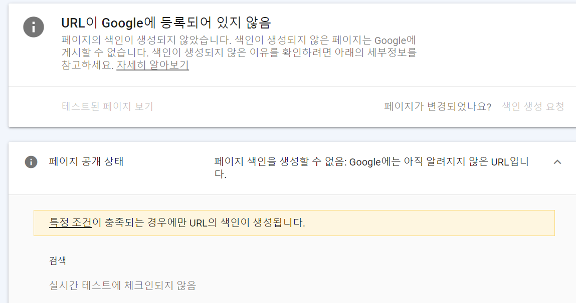 글을 작성하고 구글서치콘솔에서 URL검사를 하던 중 위와 같은 메시지가 떴습니다. 검색해 보니 여러 글들이 있었지만, 잘 이해가 안 되어서 결론적으로 몇 시간 기다리고 하면 된다는 글이 있어서 잠시 있다 다시 하니 등록할 수 있다고 녹색 버튼과 함께 떴습니다.