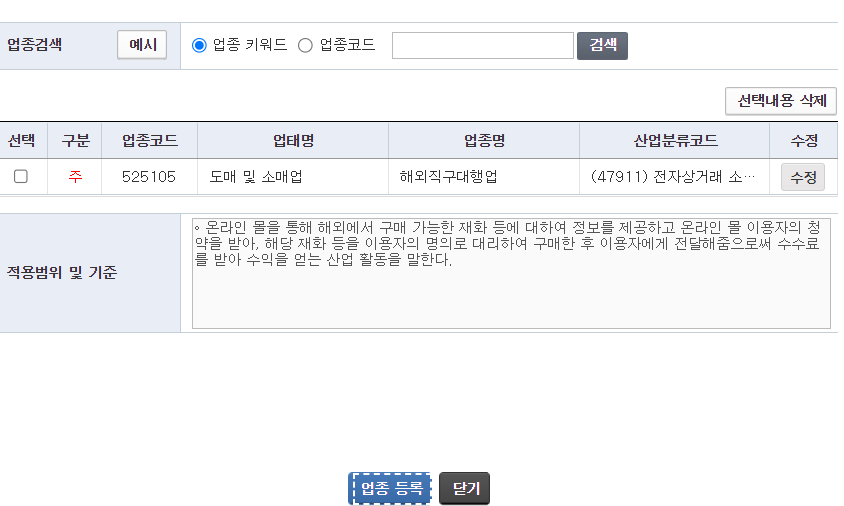 | 1인 쇼핑몰 전자상거래 소매업, 해외구매대행 주업종 부업종 추가하기 (0) | 2024.07.15 |