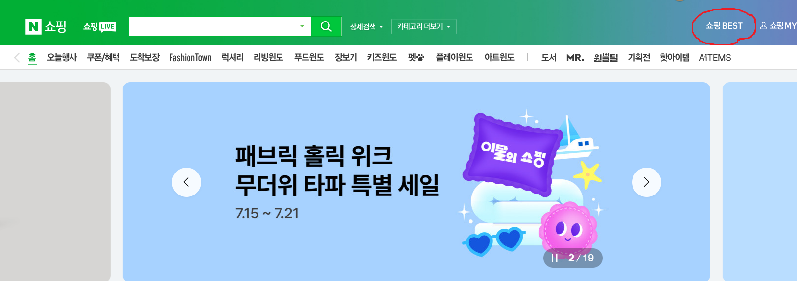 네이버에서 네이버 쇼핑 -> 카테고리별로 BEST를 알아봅니다. 이후 위탁 판매로 진행할 것이므로 먼저 도매매에서 찾아볼 것입니다.
