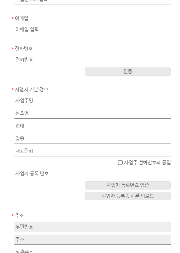 아이디와 비번을 입력하고 여러가지 정보들을 입력하고 인증도 받습니다. 사업자 등록번호 인증과 사본 업로드도 해야 합니다. 전화번호도 인증해야 합니다. 확인하지 않은 채 가입하기를 눌렀다가 안돼서 다시 확인하고 인증한 후에 회원가입을 마칠 수 있었습니다.