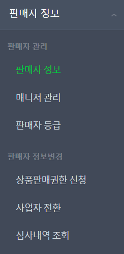 로그인한 후 메뉴에서 판매자 정보를 클릭합니다. 왼쪽 메뉴에서 쭉 아래로 내려가면 있습니다.