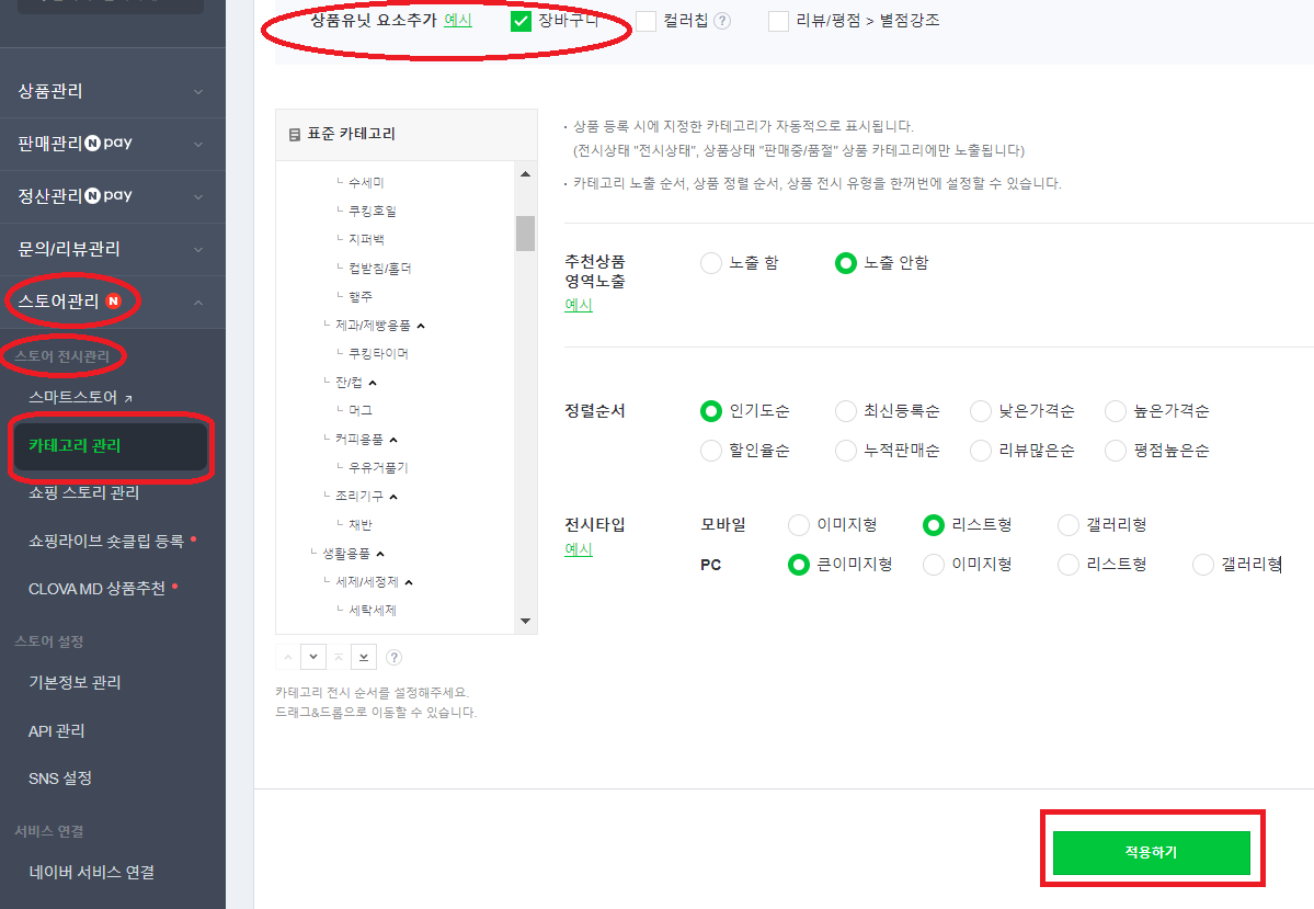 이 설정은 모바일에서는 할 수 없고 PC에서 할 수 있습니다. 스토어전시관리ㅡ>카테고리 관리는 모바일에는 나타나지 않습니다.