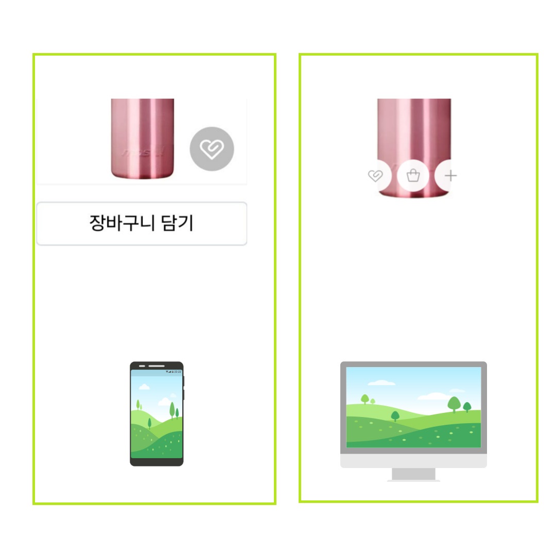 이제 모바일에선 전체 상품 보기에서 장바구니 담기 버튼이 보여지며, PC에서는 제품 사진에 장바구니 아이콘이 보여져서 고객이 보다 쉽게 장바구니에 담을 수 있습니다. 장바구니에 들어간 제품과 찜을 누른 제품은네이버 FOR YOU에서 제품을 다시 보여 주게 되므로 구매 확률을 높여주게 됩니다.