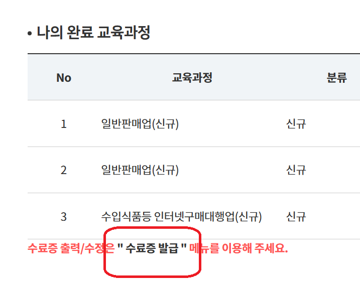 회원가입하고 로그인한 후 건강기능식품(신규) 영업신고를 위한 교육을 클릭하고 수강료 2만 원을 결제한 후 강의를 듣습니다. 강의를 다 수강한 후에는 시험이 있답니다. 문제는 5개 문항입니다. 60점 이상이면 통과입니다. 수료증을 발급받습니다.