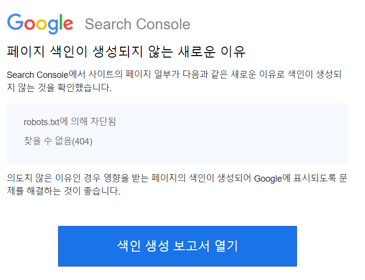 구글에서 많은 양의 사이트가 색인이 생성되지 않는다는 메일이 왔습니다. "새로운 이유로 인해 사이트의 페이지에 대한 색인이 생성되지 않습니다"