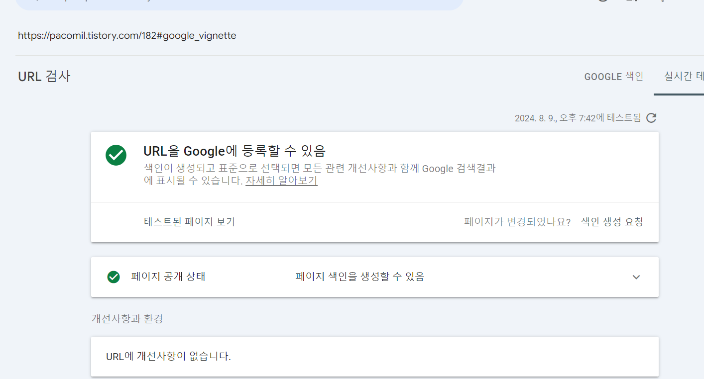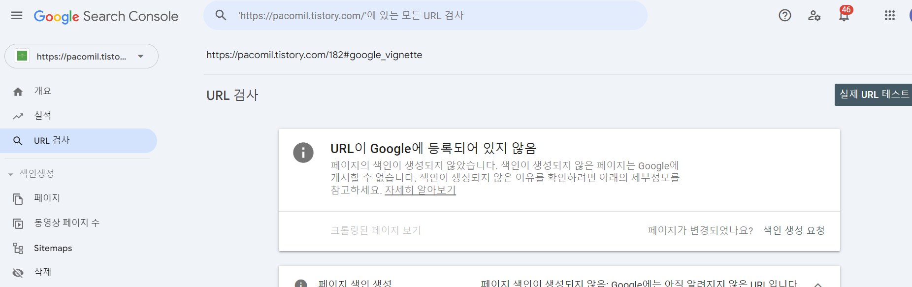 블로그의 모든 글을 실제 URL테스트를 하였고 색인 생성 요청 한 결과