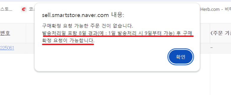 저는 고객에게 톡톡과 문자로 구매 확정을 요청하였으나, 소식이 없어 찾아보니, 스마트스토어 센터에서 구매확정 요청을 할 수 있는 방법이 있었습니다. 6일에 발송처리하였는 데, 안내 문구에 따르면 8일이 지난 9일째 되는 14일에 구매확정 요청이 가능합니다.