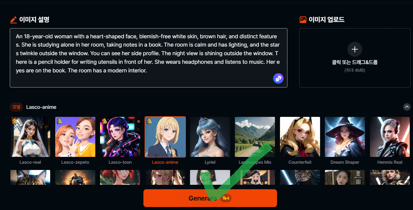 그리고 아래 그림에는 라스코 - 애니메이션을 클릭이 되어져 있는 것을 볼 수 습니다. 아래의 빨간 버튼 Generate를 클릭합니다. 모델은 라스코 애니메이션에 스타일은 지브리 스타일을 선택하고 이미지를 생성했습니다.