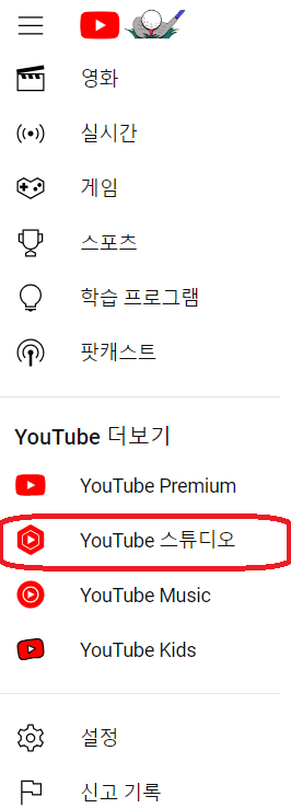 유튜브 화면의 왼쪽 아래로 내려가면 유튜브 스튜디오 가 있습니다. 거기에서