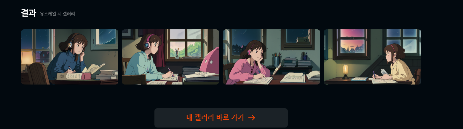 화면 아래에 Lo-fi음악 유튜브 이미지를 쉽게 만드는 방법을 클릭합니다. 안 보이면 > 화살표를 클릭하면 Lo-fi음악 유튜브 이미지를 방법에 대한 프롬프트가 자동으로 적용됩니다. 따로 입력하지 않아도 됩니다.