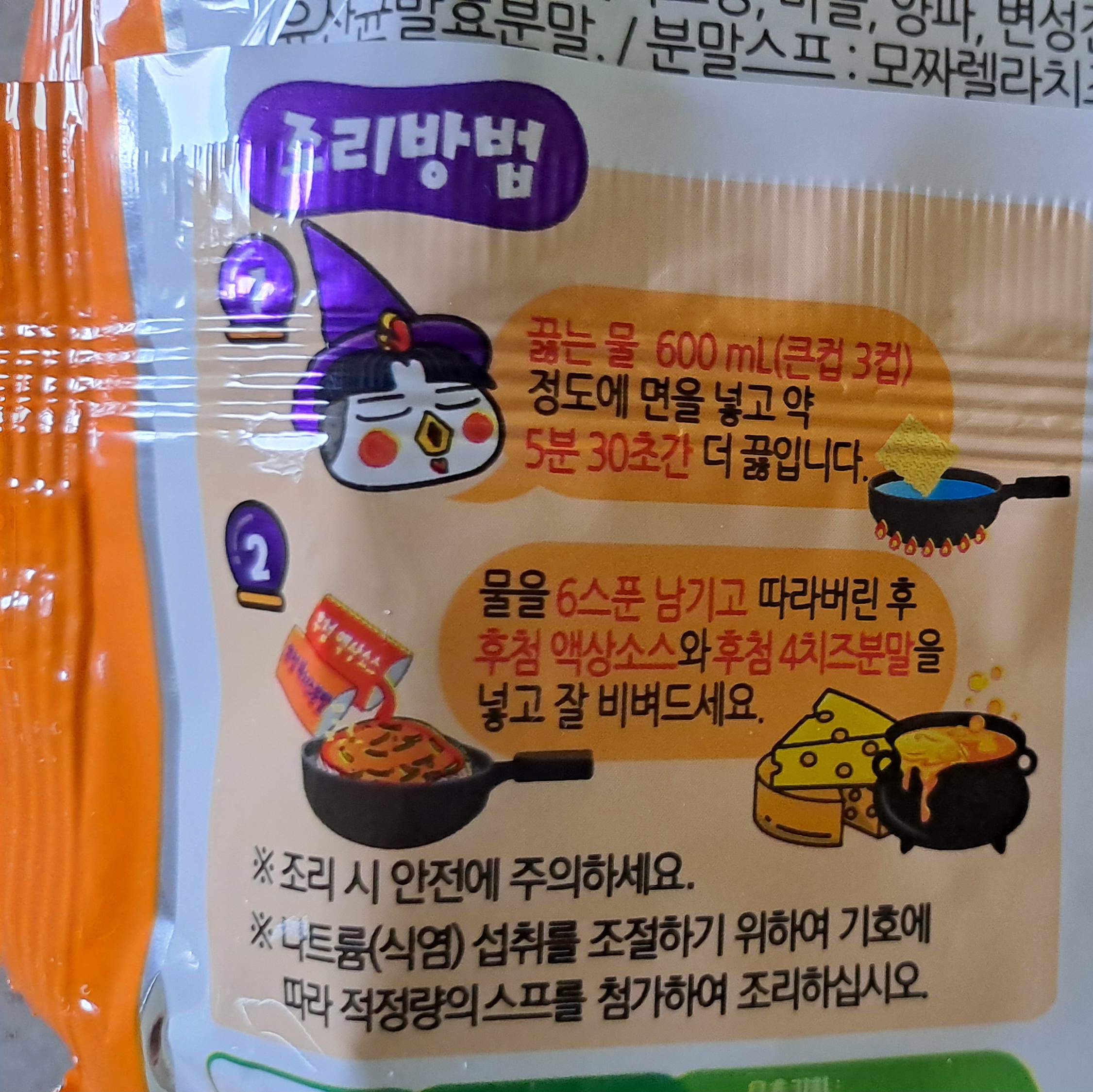 포장 봉지의 레시피에는 면을 끓인 후 물을 조금 남긴 뒤 액상소스와 후첨 4 치즈분말을 넣으라고 되어있습니다. 하지만 매운 것에 약한 저는 치즈분말이 있어도 매웠습니다.