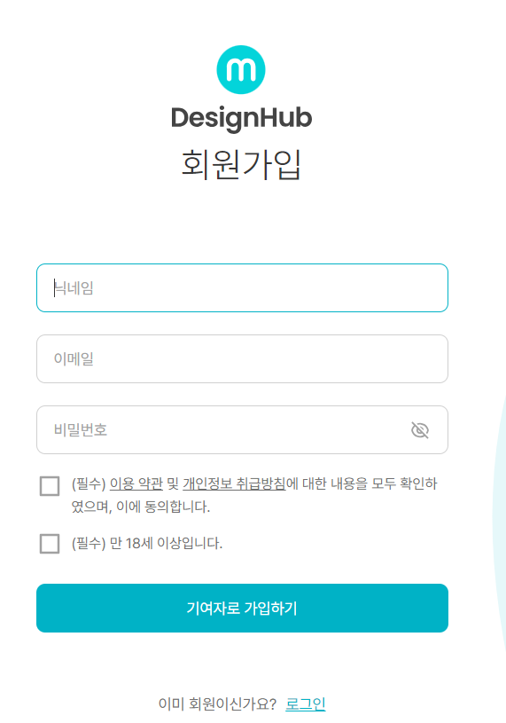 2. 디자인허브 기여자 되기를 클릭합니다. 로그인이 안되어있으면 로그인합니다. 회원가입이 안되어 있다면 원하는 계정으로 회원가입 합니다.