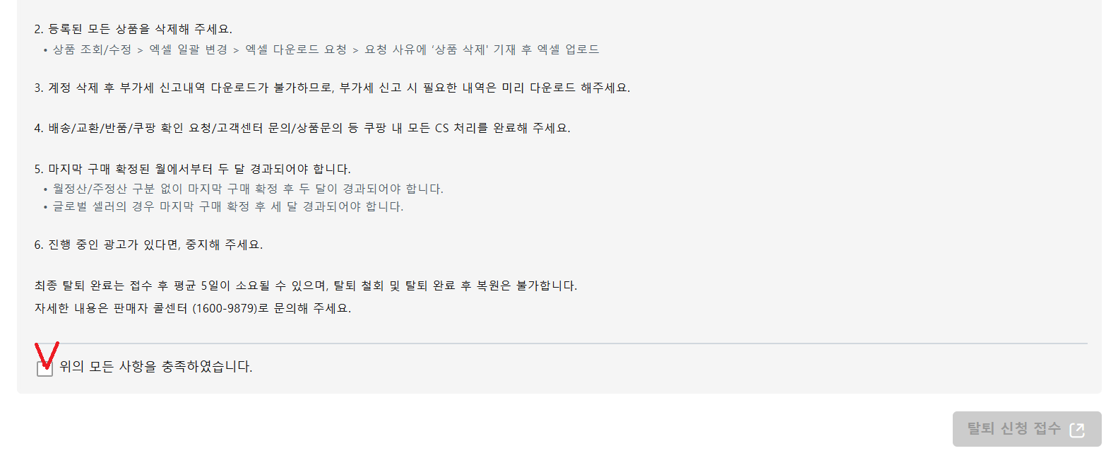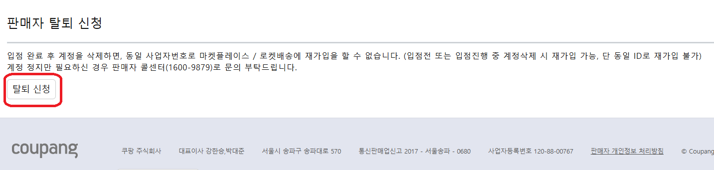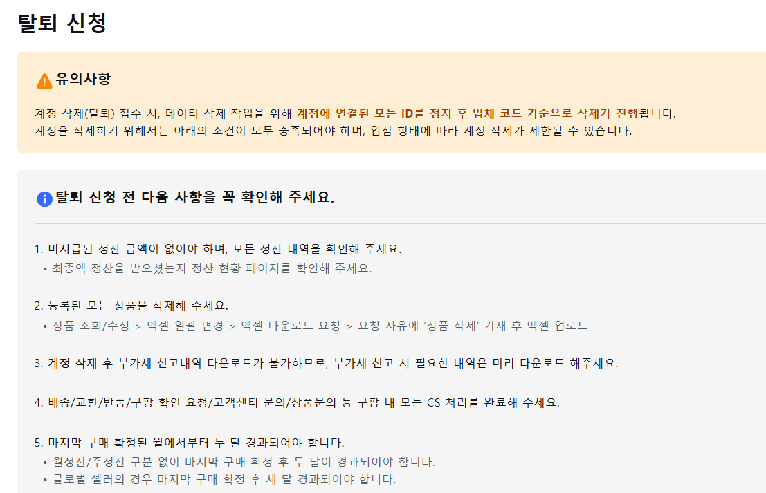 2. 판매자 정보> 계정 정보> 판매자 탈퇴 신청 하단 탈퇴 신청 클릭> 탈퇴 신청이라고 되어 있습니다.