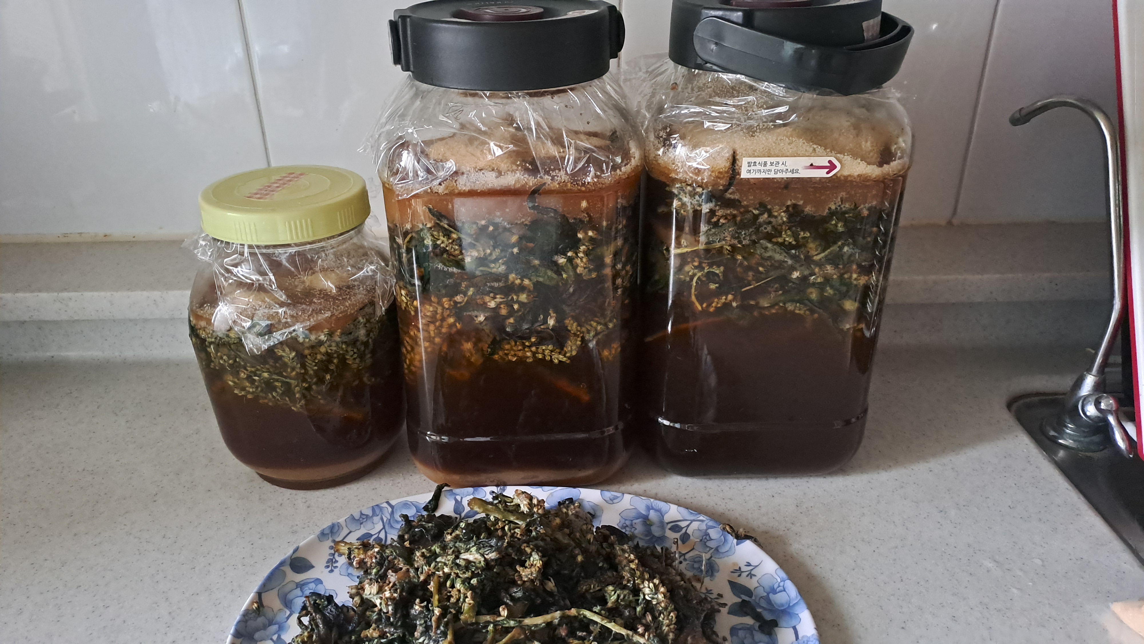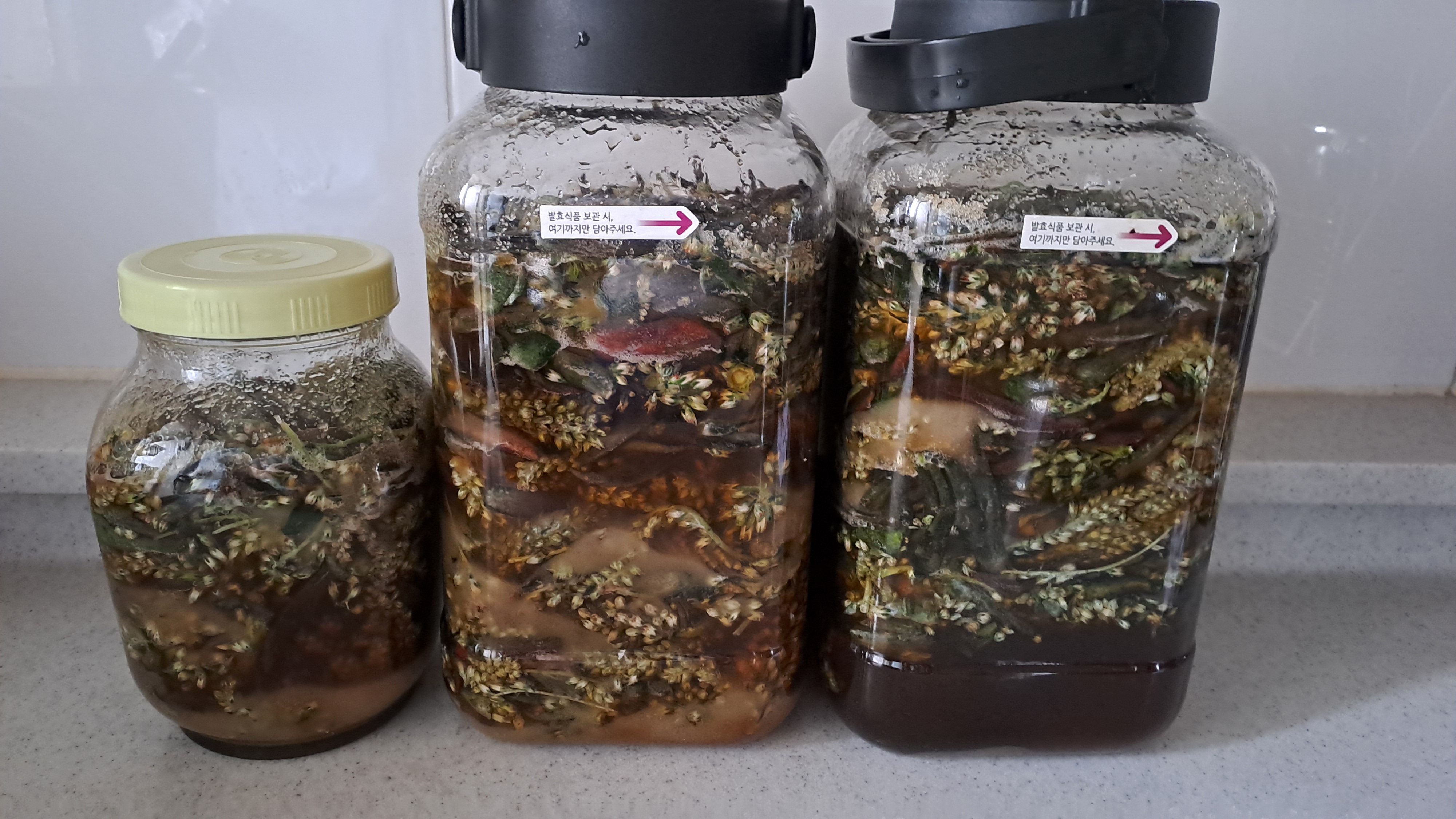 생각보다 물이 많이 나왔습니다. 첨엔 한 대여섯 군데 담았다가 부피가 줄어 저렇게 세 군데 다시 옮겨 담았습니다.