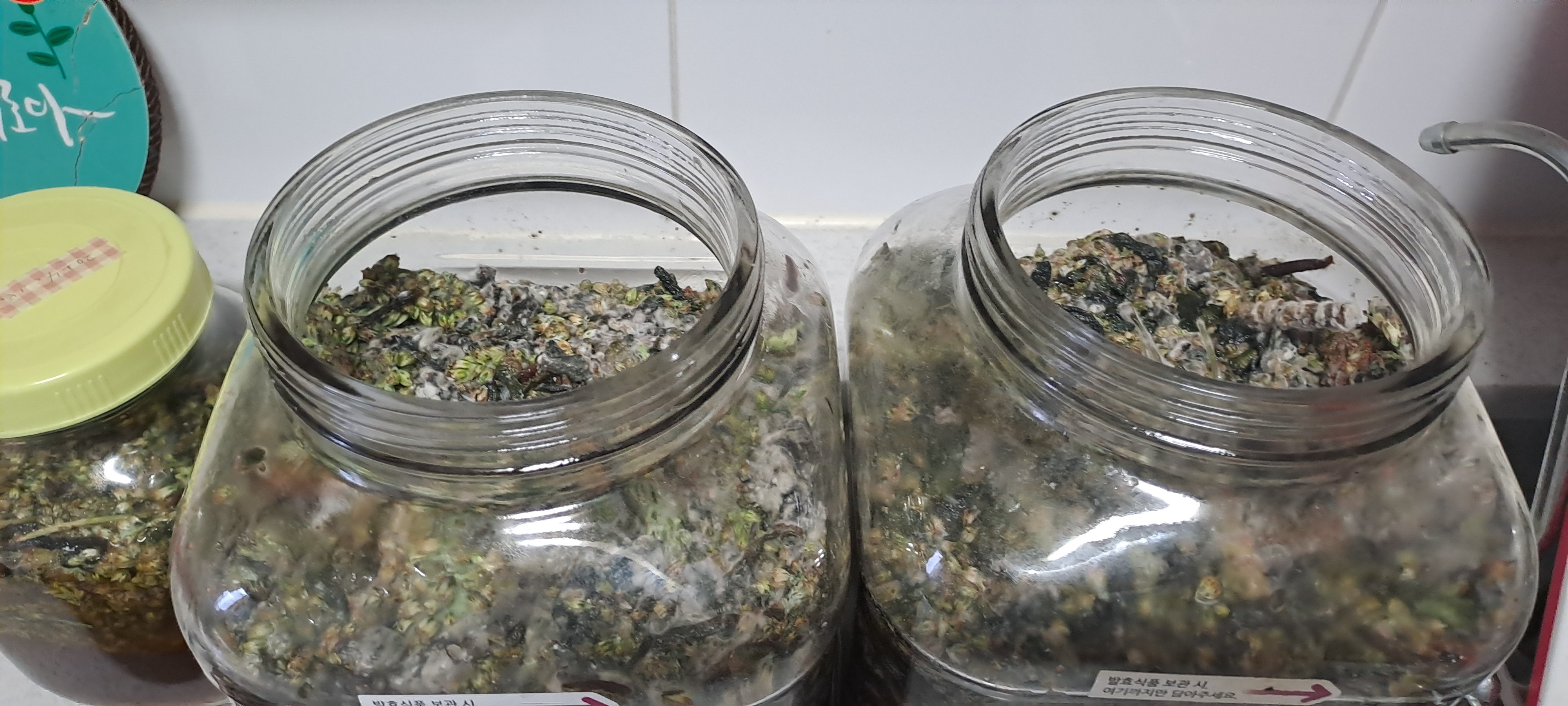 싱크대에 저 상태로 며칠을 두었더니 흰 곰팡이가 생겼습니다. 한번씩 열어서 눌러주느라 뚜껑도 제대로 닫히지 않았었습니다.