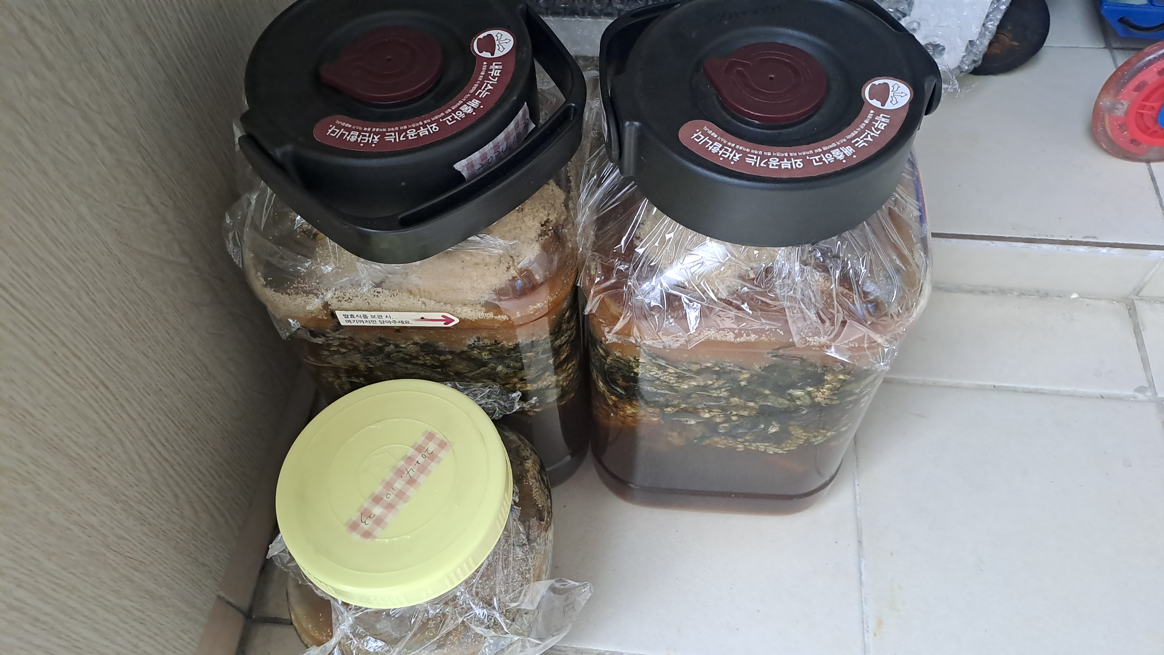 처음 만든 후 놔뒀던 베란다 한 구석으로 다시 놔두었습니다. 햇볕이 잘 들어오지 않는 쪽입니다. 와송청을 담은 날짜는 만든 직후 테이프에 적어서 붙여두었습니다.