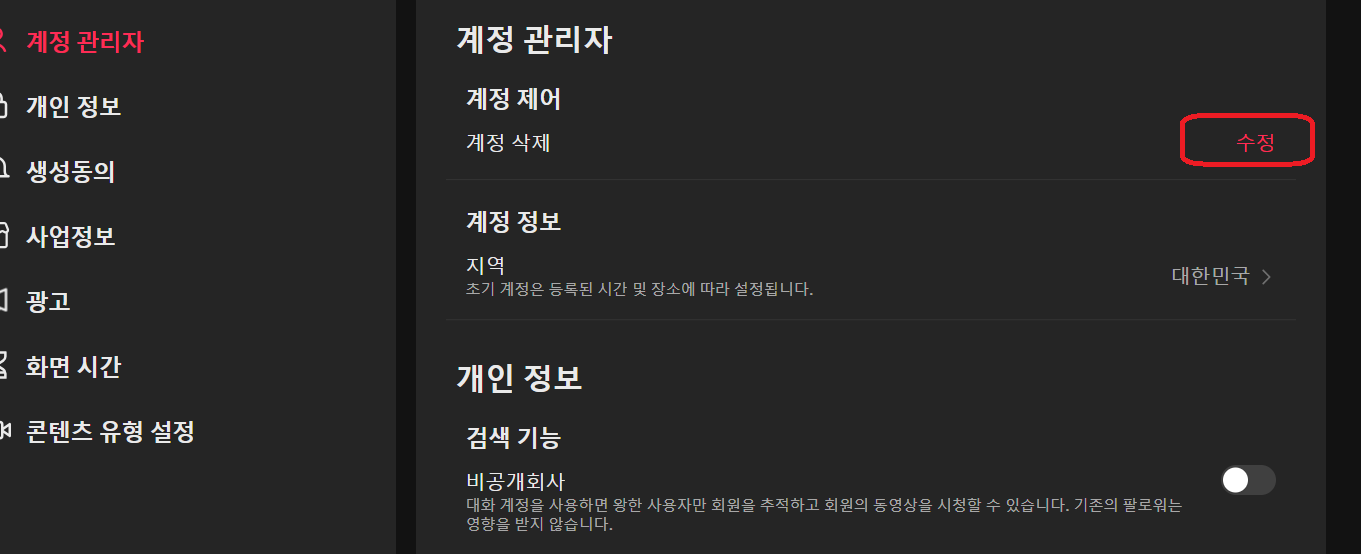 계정 관리자의 계정 삭제에서 수정을 클릭합니다.