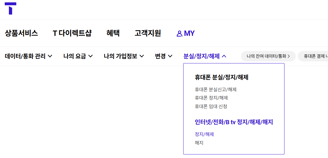 티월드 로그인-> MY-> 분실/정지/해제 -> 인터넷/전화/B tv정지/해지->해지로 들어갑니다.