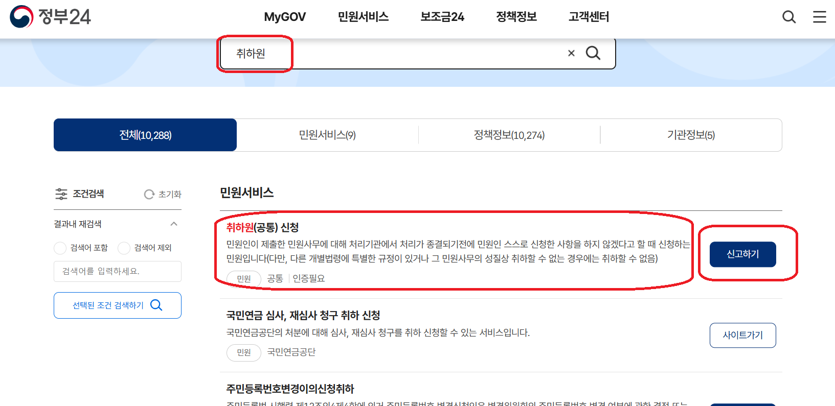 다시 정부 24에 들어가서 취소처리하려니 취소 버튼이 없어서 고객센터로 문의하였습니다. 취소처리는 정부 24 검색어에 취하원을 입력하고 취하원을 신청하면 된다고 합니다. 지불한 돈에서 천 원의 수수료가 빠지고 25000원이 환불된다고 합니다.