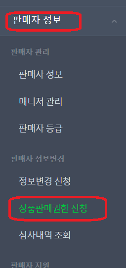 판매자 정보->상품판매권한 신청으로 들어갑니다.
