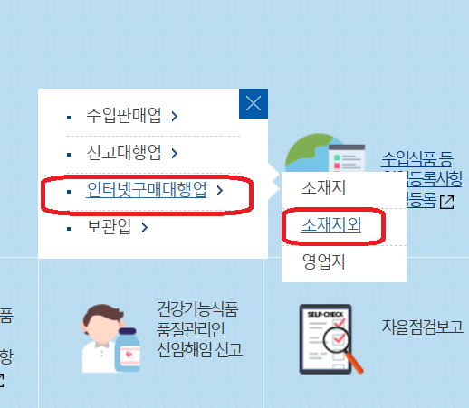 클릭하면 선택창이 뜹니다. 인터넷 구매대행업 소재지외를 클릭합니다.