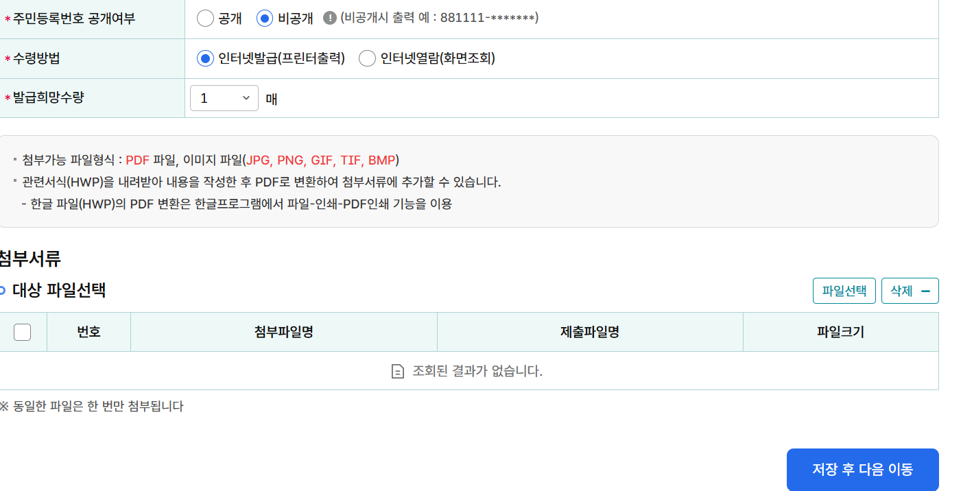 다른 것은 그대로 두고 저장 후 다음 이동을 클릭하였습니다. 따로 신청비는 없었으며 얼마지않아 처리 완료 문자가 왔습니다.
