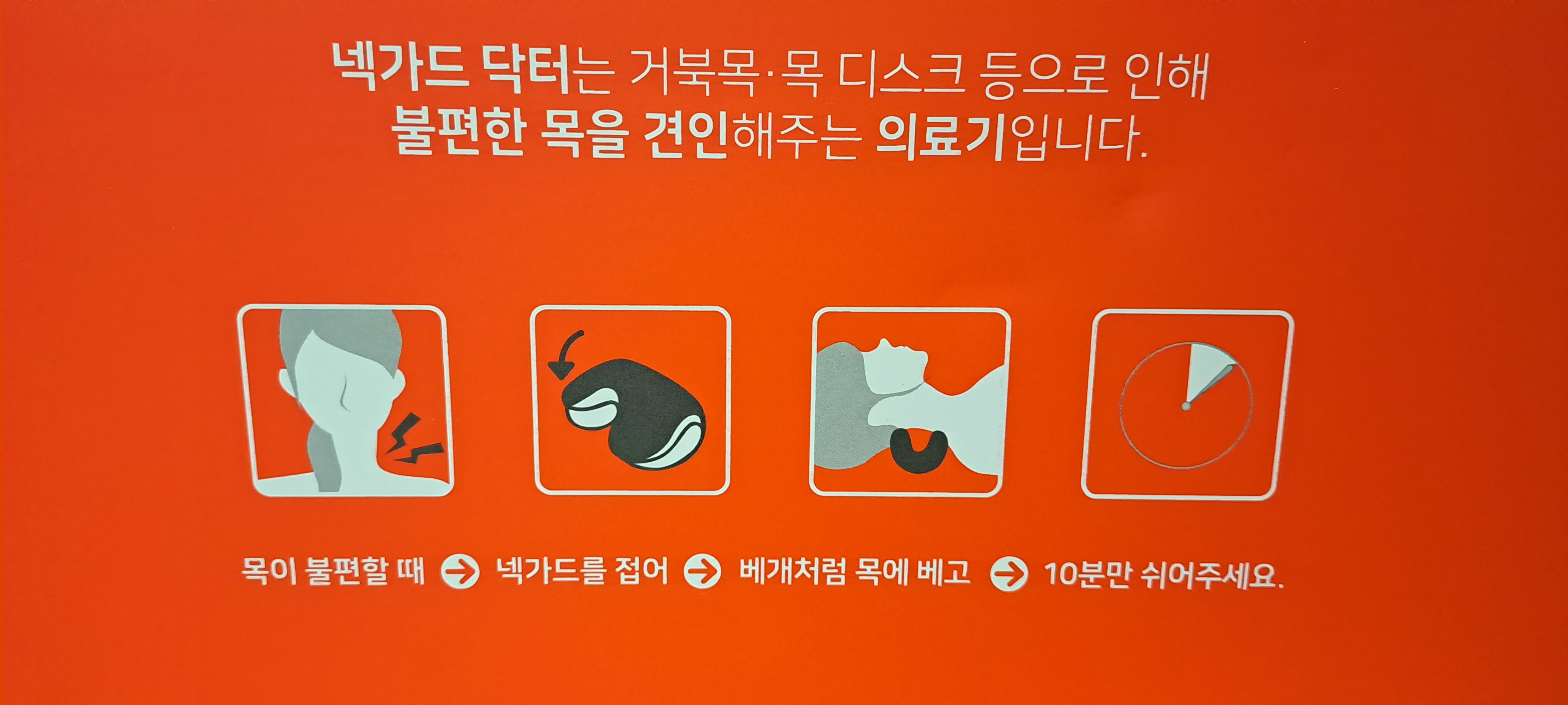 고정된 자세로 스마트폰을 본 이후로 거북목이 상당히 진행되어 줄곧 목이 불편하였습니다. 근래에 한번 더 목과 어깨에 무리가 간 일을 한 뒤론 그 증세가 심해서 내 목이 어떻게 된 건가 싶을 정도로 통증이 와서 급하게 넥가드 닥터를 주문하였습니다. 몇 년 전부터 가수 백지영 씨가 소개하는 영상을 본 터라 알고 있다가 가격도 좀 있어서 망설이고 있었는 데, 참기에는 어려운 통증이 오자 급하게 주문한 것입니다.