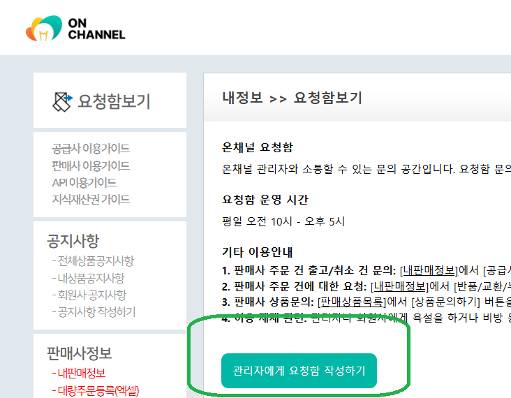 온채널에서 상단 오른쪽의 마이페이지를 클릭하고 왼쪽 상단의 요청함보기를 클릭합니다.