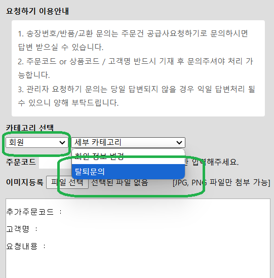 카테고리 선택에서 회원 ㅡ> 탈퇴문의하기를 클릭합니다.