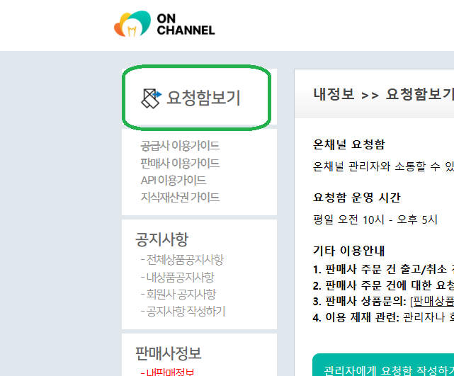 온채널에서 상단 오른쪽의 마이페이지를 클릭하고 왼쪽 상단의 요청함보기를 클릭합니다.