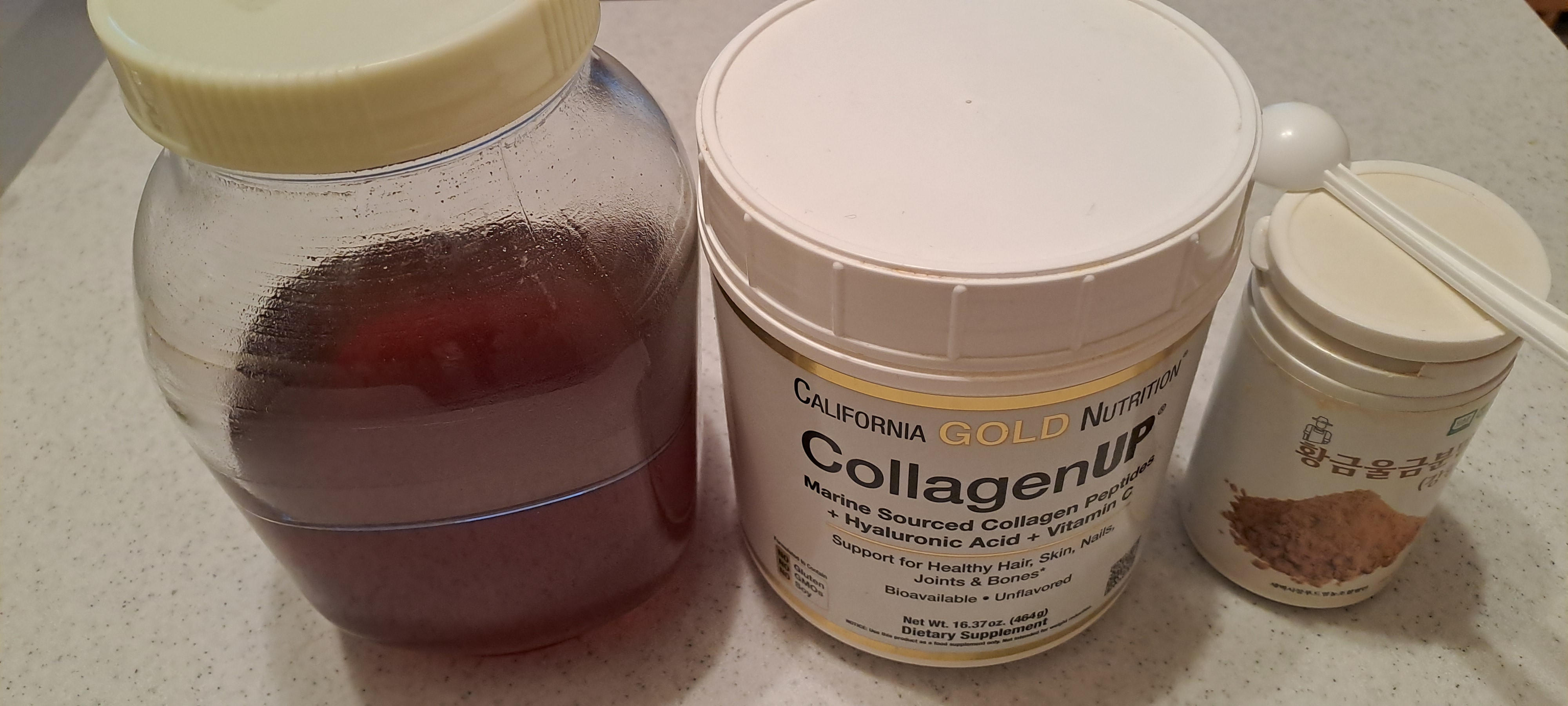 울금 가루도 써서 먹기가 쉽지 않은 데, 꿀과 함께 마시면 수월합니다. 사람마다 차이가 있겠으나, 자기 전 이렇게 마시고 자면 아침에 주름이 좋아진 것을 볼 수 있었습니다. 낮에도 마시긴 하는 데, 낮보다는 저녁에서 밤사이가 좋았던 것 같습니다. 콜라겐 가루가 비려서 드시기 힘드셨다면 꿀과 울금 가루와 함께 차로 드셔보시길 추천합니다.