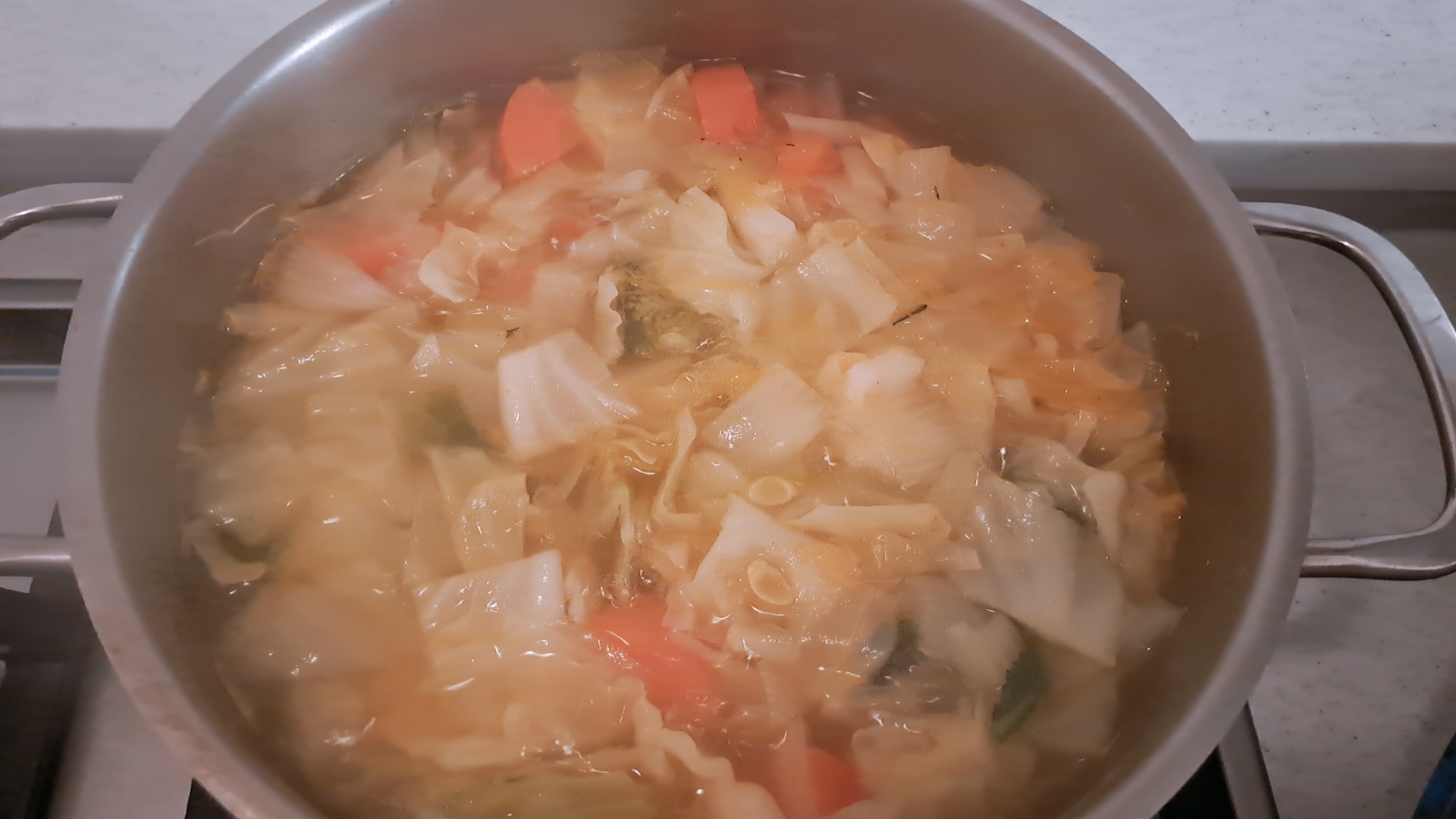 기본 채소 수프에 주재료는 양배추, 단호박, 당근, 양파이며 여기에 토마토, 브로콜리, 무, 고구마, 우엉, 연근, 미나리, 시금치 등등의 채소를 더해도 됩니다. 집에있는 채소 자투리도 버리지 말고 사용합니다.