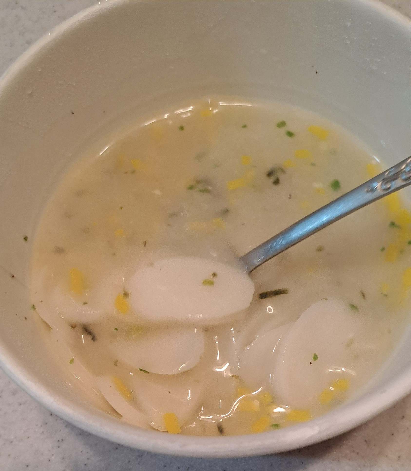다 되어 먹어보니 그냥 만든 떡국처럼 아주 맛있는 떡국입니다. 떡도 부드럽고 말랑말랑한 식감도 좋고 국물도 사골베이스로 부드럽고 맛있습니다. 피곤하거나, 뭔가 출출하여 먹고 싶을 때, 아님 야외에서 뜨거운 물만 있으면 언제든지 간편하고 맛있게 먹을 수 있고 속도 든든합니다.