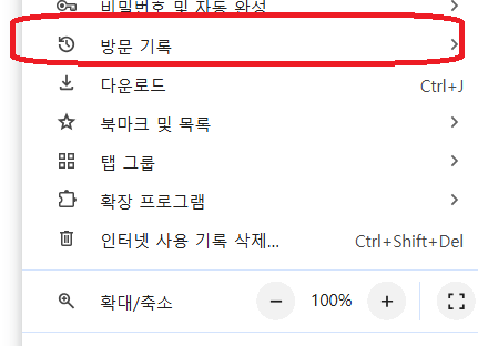 인터넷 화면 오른쪽 점 3개를 클릭합니다. 클릭하면 방문 기록이 있습니다. 클릭합니다.