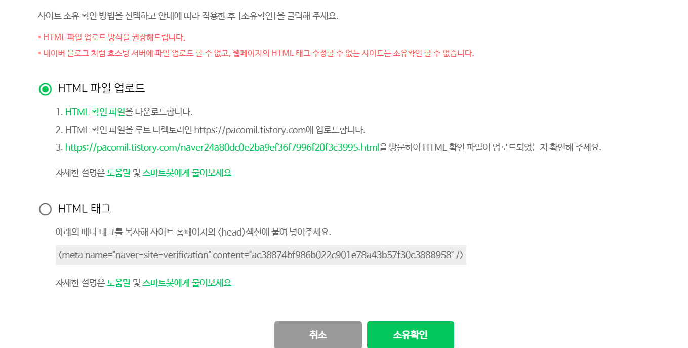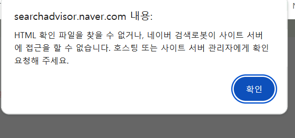소유권 확인을 위 HTML 파일 업로드를 선택해서 하니 에러 메시지가 떴습니다.