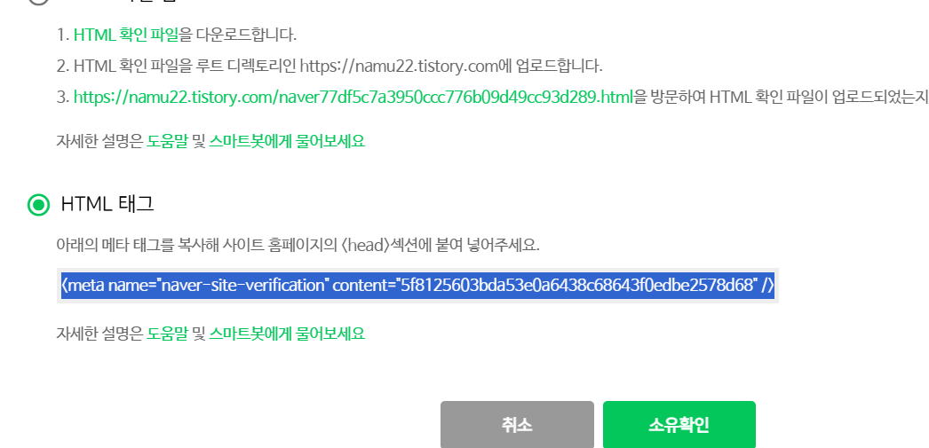 그래서 방법을 검색하다 찾기 어려워서 아래 HTML태그를 선택하고 메타태그를 복사해서 사이트 홈페이지의 head섹션에 붙여 넣어주었습니다.