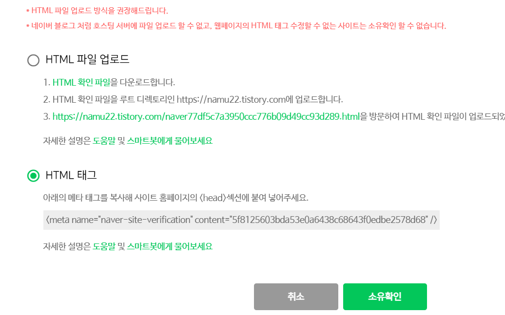 블로그 2개가 등록되어 있었는 데, 하나는 쉽게 소유 확인이 되었는 데 한 블로그는 " HTML 확인파일을 찾을 수 없거나 네이버 검색 로봇이 사이트서버에 접근을 할 수 없습니다!"는 메시지가 떠서 이리저리 찾다가 소유 확인이 되어서 제가 한 방법을 올립니다.