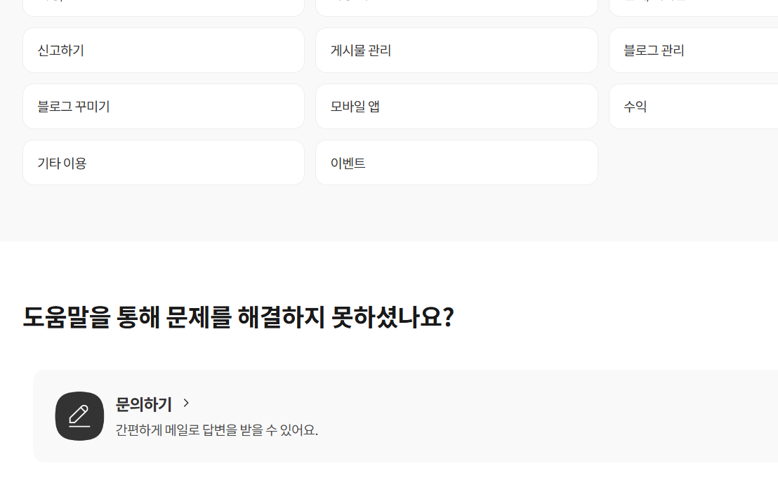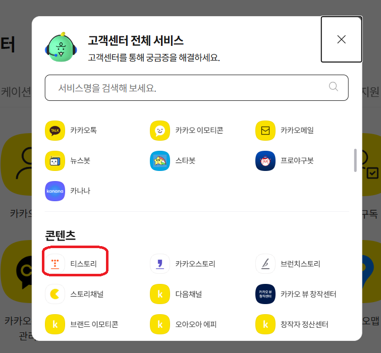 팝업창을 스크롤해서 내려가면 티스토리가 있습니다. 쭉 내려가면 문의하기가 있습니다.