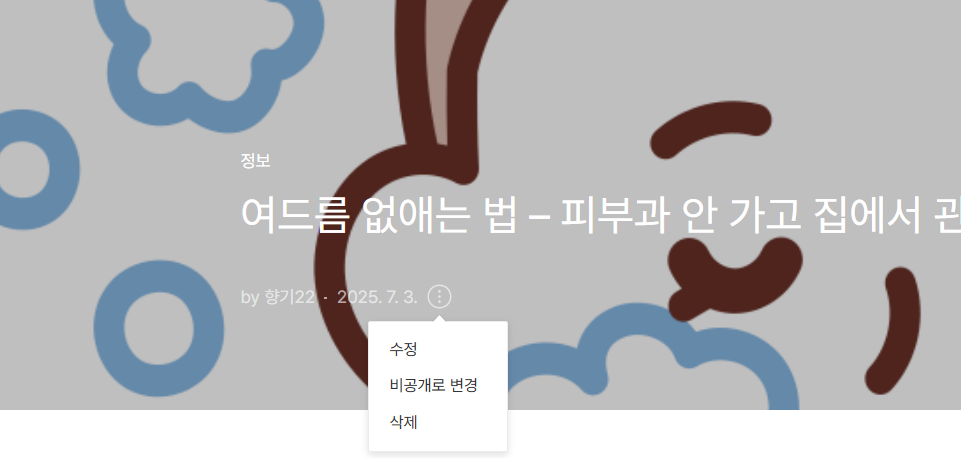 그리고 점 3개를 누르니 수정과 비공개 및 삭제할 수 있음을 알게 되었습니다. 이로써 오전부터 고민한 썸네일 문제가 해결되고 종료되었습니다. 학교 다닐 때처럼 궁금한 것을 바로 물어볼 수 있는 대상이 없어 아쉬웠고 혼자 찾고 찾아야 하니 좀 어려웠습니다. 티스토리 운영에 관해서 카페나 모임이라도 있으면 문제가 터질 때마다 물어볼 수 있을 텐데 말입니다.