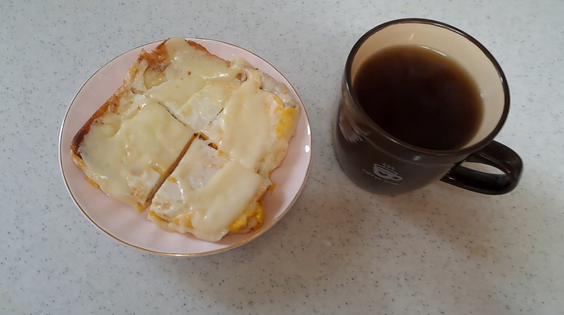 오늘은 팬에 버터를 올리고 식빵을 구운 후 계란을 풀고 그 위에 식빵을 올린 후 계란이 익기까지 기다렸다 불을 끄고 하바티 치즈를 맨 아래 깔고 녹기까지 기다렸다가 다시 뒤집어서 접시에 올렸습니다.
