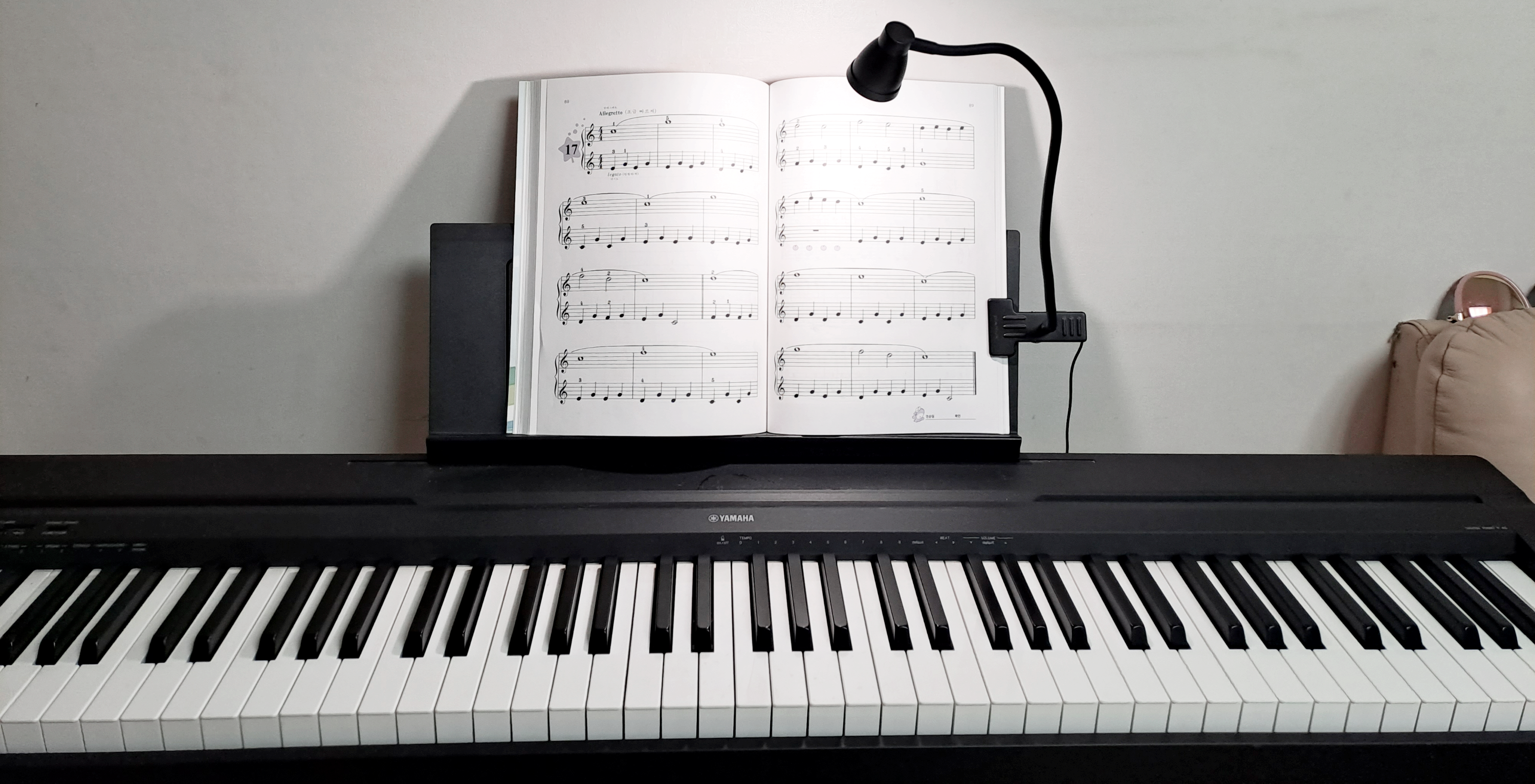 한 가지 소개하고 싶은 것이 있다면 악보 조명이다. 거실 등을 등지고 쳐야 했기에 더더욱 필요했다. 원하던 디자인의 조명을 한참 찾아 발견하고 주문하였는 데 조명색 또한 너무 이쁘고 쓰기 편하여 소개하고자 한다.