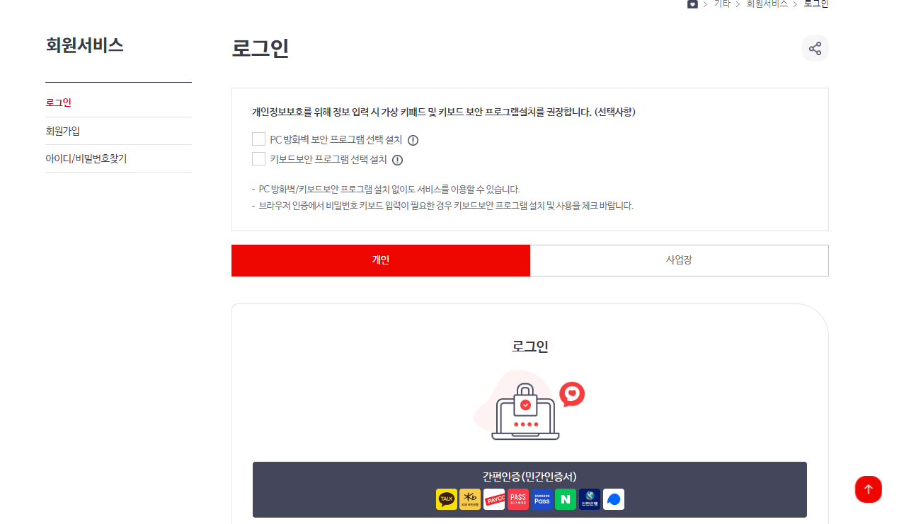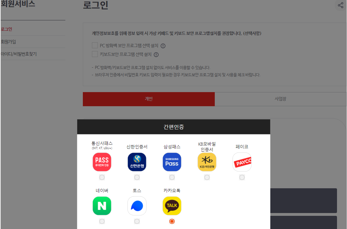 로그인 페이지가 나오는 데, 간편 인증도 있으니, 편한 방법으로 로그인하시면 됩니다. 저는 카카오로 로그인했습니다.